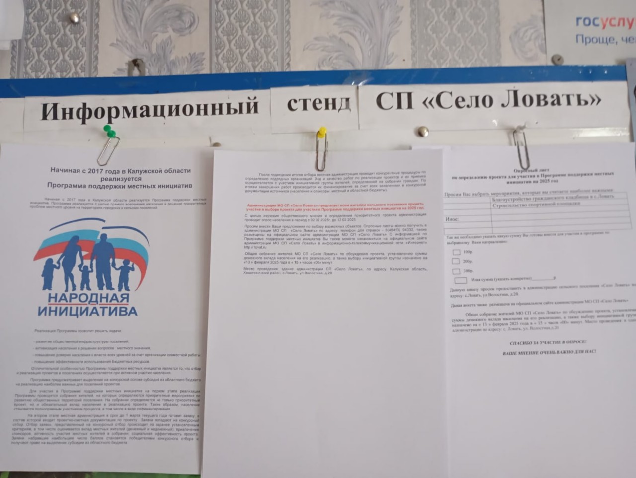 Просим внести Ваши предложения по выбору возможных объектов. Опросные листы можно получить в администрации МО СП «Село Ловать» по адресу: телефон для справок - 8(48453) 94332, также размещены на официальном сайте администрации МО СП «Село Ловать» С информацией по Программе поддержки местных инициатив Вы также можете ознакомиться на официальном сайте администрации МО СП «Село Ловать» в информационно-телекоммуникационной сети «Интернет» http:// lovat,ru.